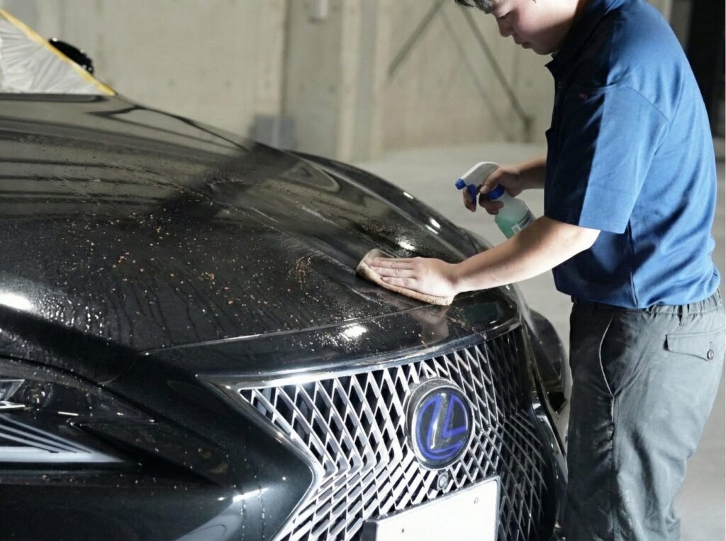 まさに、今回のレクサスにピッタリのコーティング剤です。 では、実際にどのような工程で「新車の輝き」を作り出していくのか、MIYABIの施工現場を公開します。