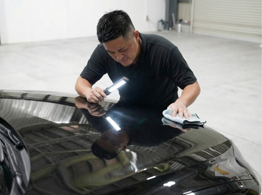 特に黒い車は、下手な業者が磨くと「オーロラマーク」と呼ばれるギラギラした磨き跡が残ってしまいます。 年間数百台を施工するMIYABIの職人は、この微細な傷一つ見逃しません。